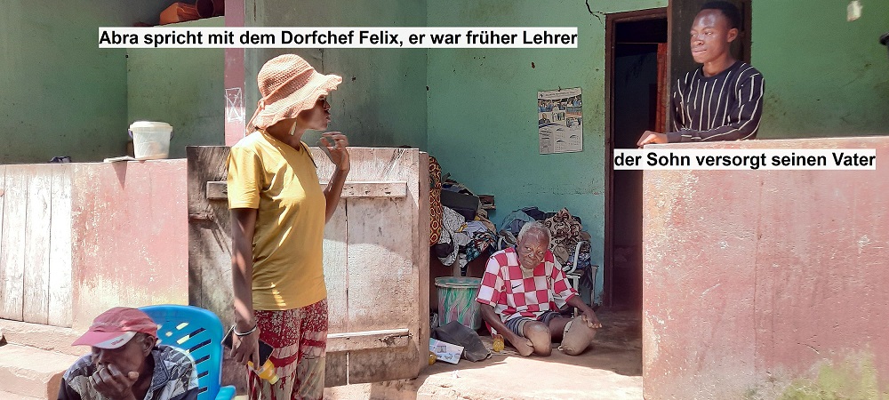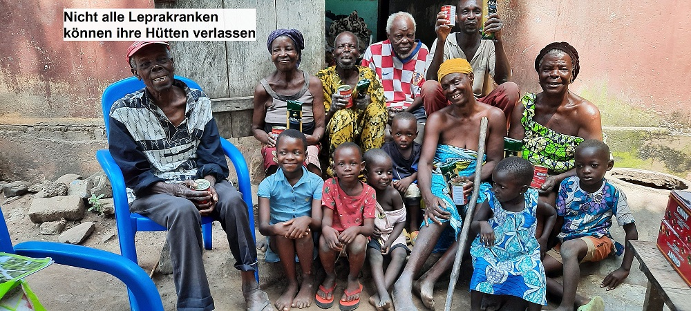 Wir fahren Richtung Kpalime, nahe an der Grenze zu Ghana. Nach knapp 2 Stunden Fahrzeit kommen wir in der Stadt an. Ich möchte Lebensmittel fürs Lepradorf kaufen und wir werden fündig. Durch eine kleine Holztür kommen wir in einen Laden, vollgestopft bis an die Decke, mit allen möglichen Gebrauchsgegenständen und Lebensmitteln. Abra spricht Ewe mit dem Verkäufer, das geht flüssiger als französisch. Wir kaufen Reis, Spaghetti, Tomatendosen, Maniok, Öl und für die Kinder Kekse und Getränke. Die Preisverhandlung dauert länger als der Einkauf. Gehört in Togo dazu. Mit dem vollgeladenen Auto geht es noch ca. 20 km weiter zum Lepradorf, das heißt Akata Dzokpe. Es ist ruhig bei unserer Ankunft. Viele Gläubige sind noch in der nahegelegenen Kirche. Ich gehe zum Haus vom Felix, dem Dorfchef. Oh je, er sitzt jämmerlich auf dem harten Steinboden. Ich frage, was ist denn passiert? Sein Rollstuhl ist schon seit einigen Monaten kaputt, für die Reparatur ist kein Geld da. Ich sage zu Abra, da kommen wir gerade zur richtigen Zeit. Mittlerweile hat sich im Dorf rumgesprochen, dass wir da sind. Es kommen viele Kinder und Jugendliche. Alle wissen, dass es von den „Weißen“etwas gibt! Auch die Kirchgänger treffen nach und nach ein. Da Felix sein einfaches Häuschen nicht verlassen kann (er hat durch die Krankheit keine Beine mehr), versammeln sich alle vor seinem Haus. Unser Fahrer packt alle Lebensmittel aus, wir sehen den Menschen die Freude an. Ich übergebe einen größeren Spendenbetrag, der von vielen kleinen und großen Spendern in Deutschland kommt. An dieser Stelle ein herzliches Danke! Die Kinder warten schon ungeduldig auf die Kekse und Getränke. Der Sonntag im Lepradorf ist gerettet! Es ist ein ganz besonderer Tag, wenn wir in den tristen Alltag dieser bedürftigen Menschen etwas Abwechslung durch unseren Besuch bringen. Abra spricht mit den Frauen und Kindern in Ewe, sie können kein französisch. Trotz der schweren Behinderungen welche die Menschen haben, machen sie einen zufriedenen Eindruck auf uns. Zum Dank singen sie Lieder und klatschen, soweit möglich mit ihren verstümmelten Händen. Wenn ich bei diesen Menschen bin, ist es mir überhaupt nicht nach Heiterkeit zumute. Ich versuche gelassen zu bleiben. Als die Mittagsglocken vom Kirchturm läuten, verabschieden wir uns von den 23 behinderten Leprakranken und ihren Familien und versprechen im nächsten Jahr wieder zu kommen. Die Kinder rennen unserem Auto nach, bis es an der Kurve verschwindet.